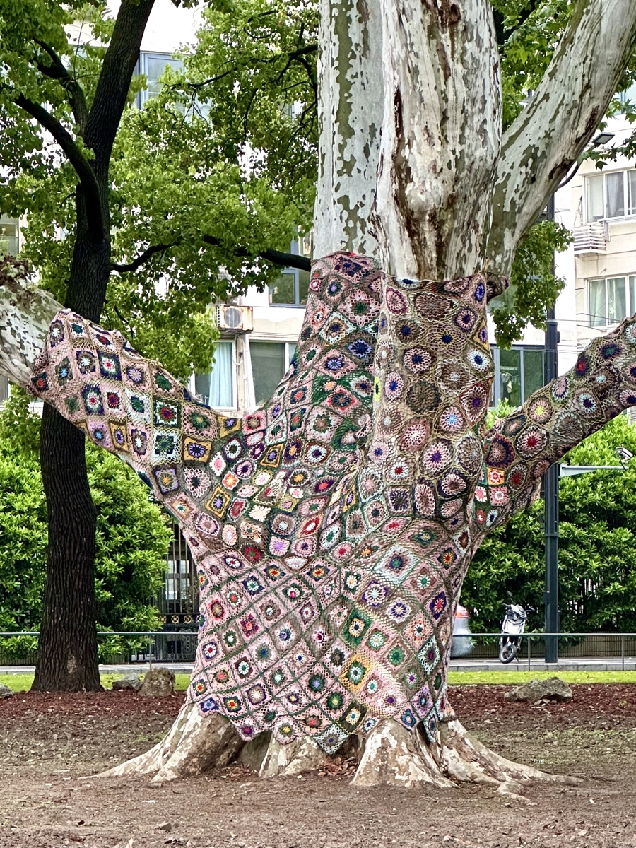 最吸睛的要数编号为0909的“华东第一悬铃木”。百年悬铃木已经穿上了用牦牛绒及非遗技艺编织的“外衣”,花卉织艺与古树肌理相融,展现出自然之美和手工之韵。