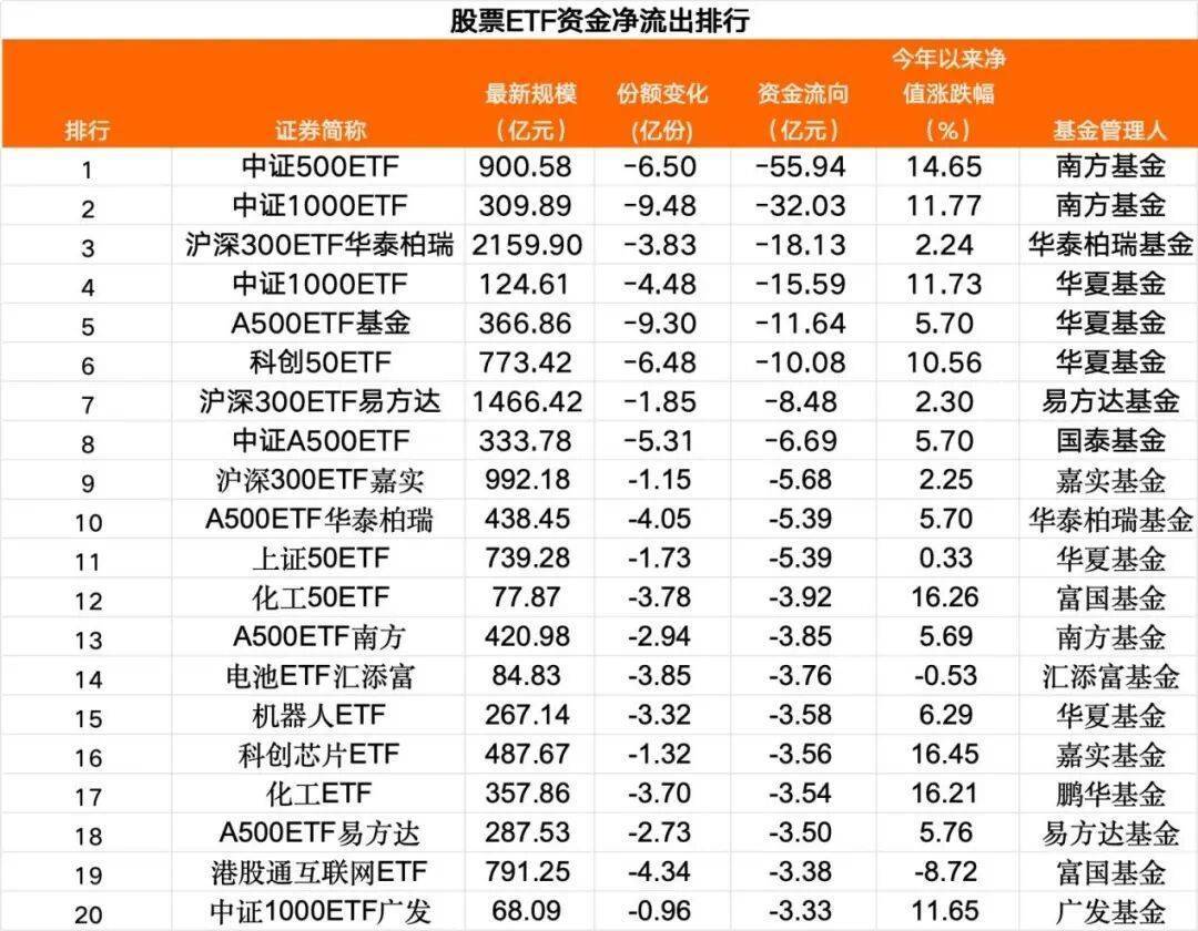 此外,股票ETF中,当日54只股票ETF净流出超过1亿元,中证500指数、中证1000指数、沪深300指数、A500指数、科创50指数等宽基ETF,以及化工、电池、机器人、科创芯片等行业主题ETF是资金净流出较多的品种。